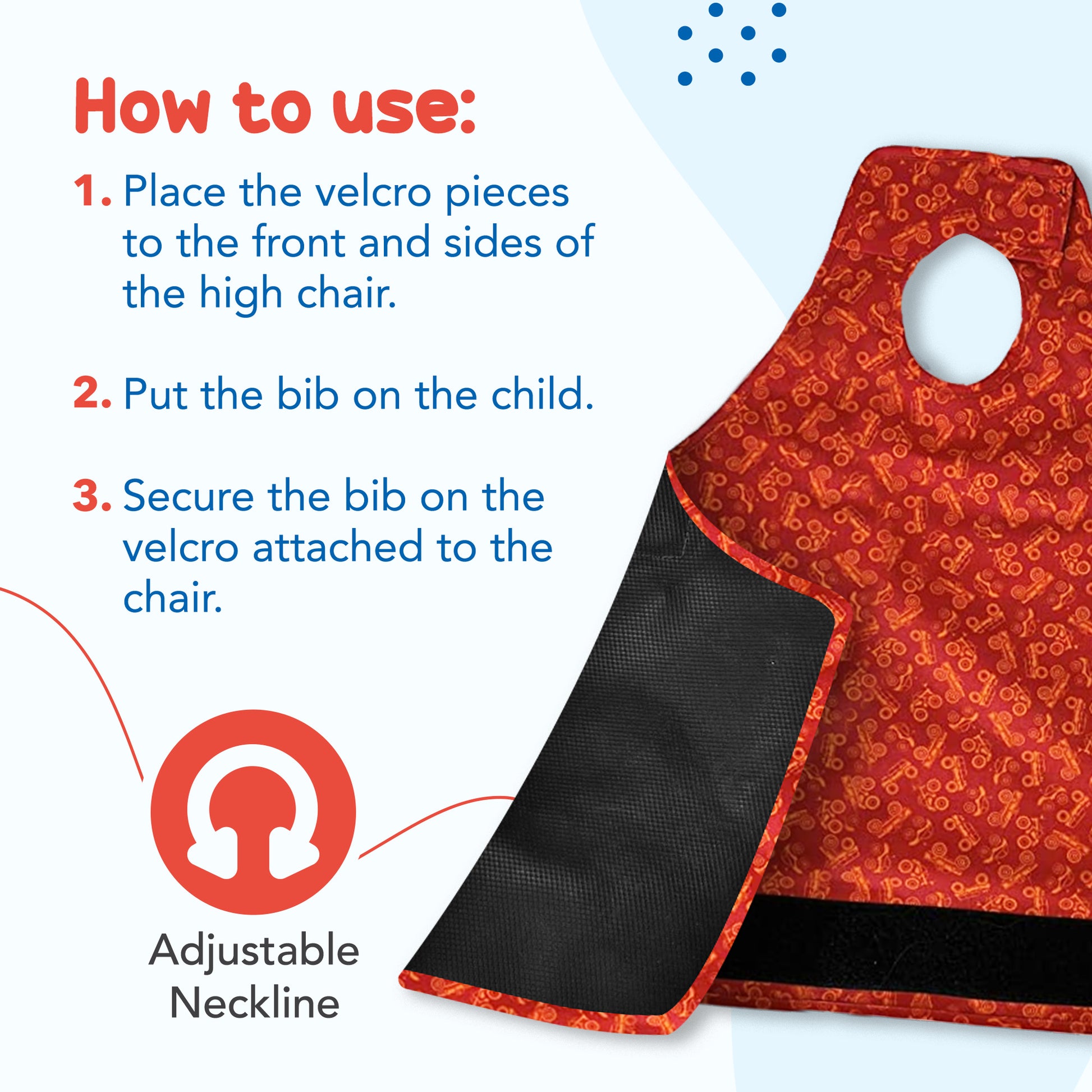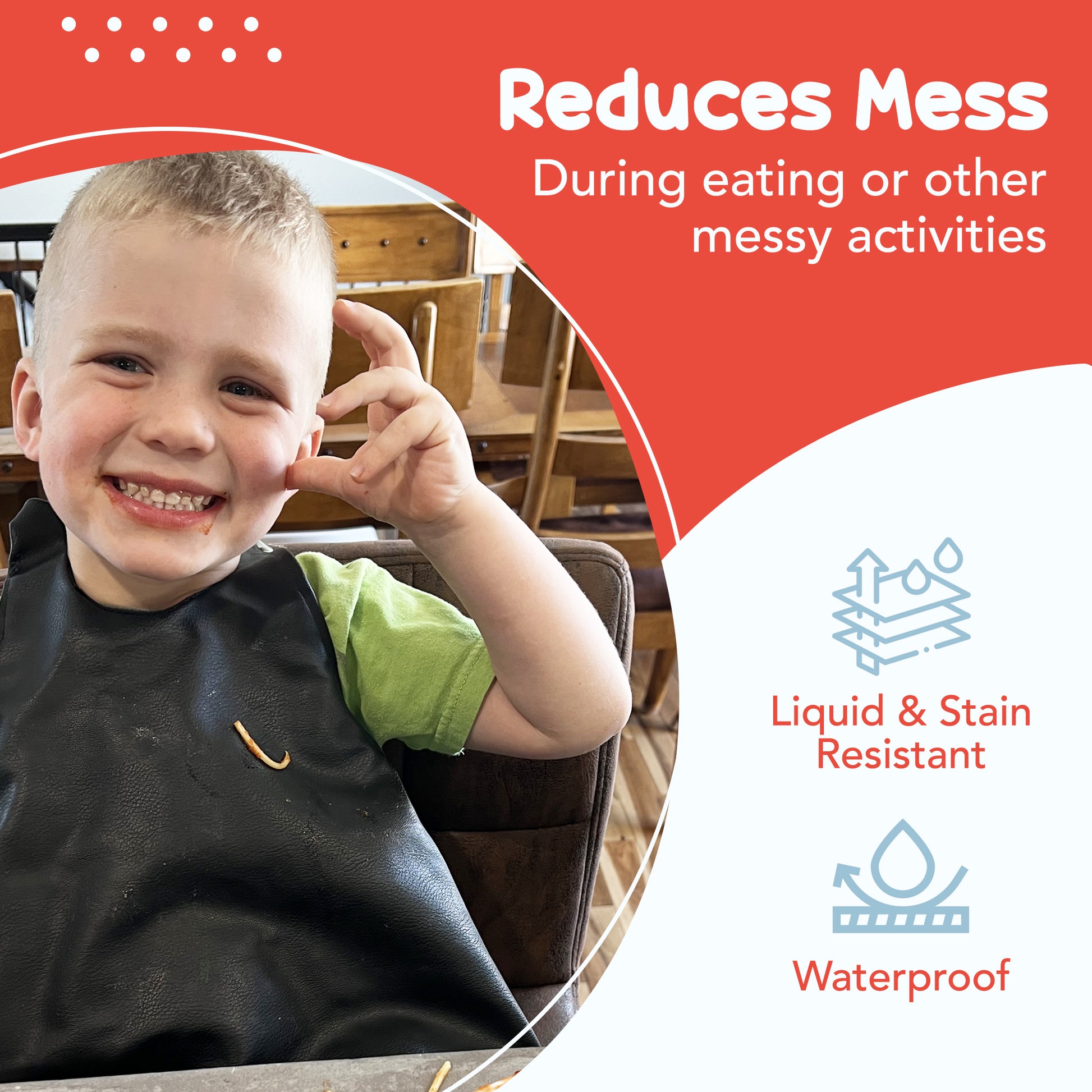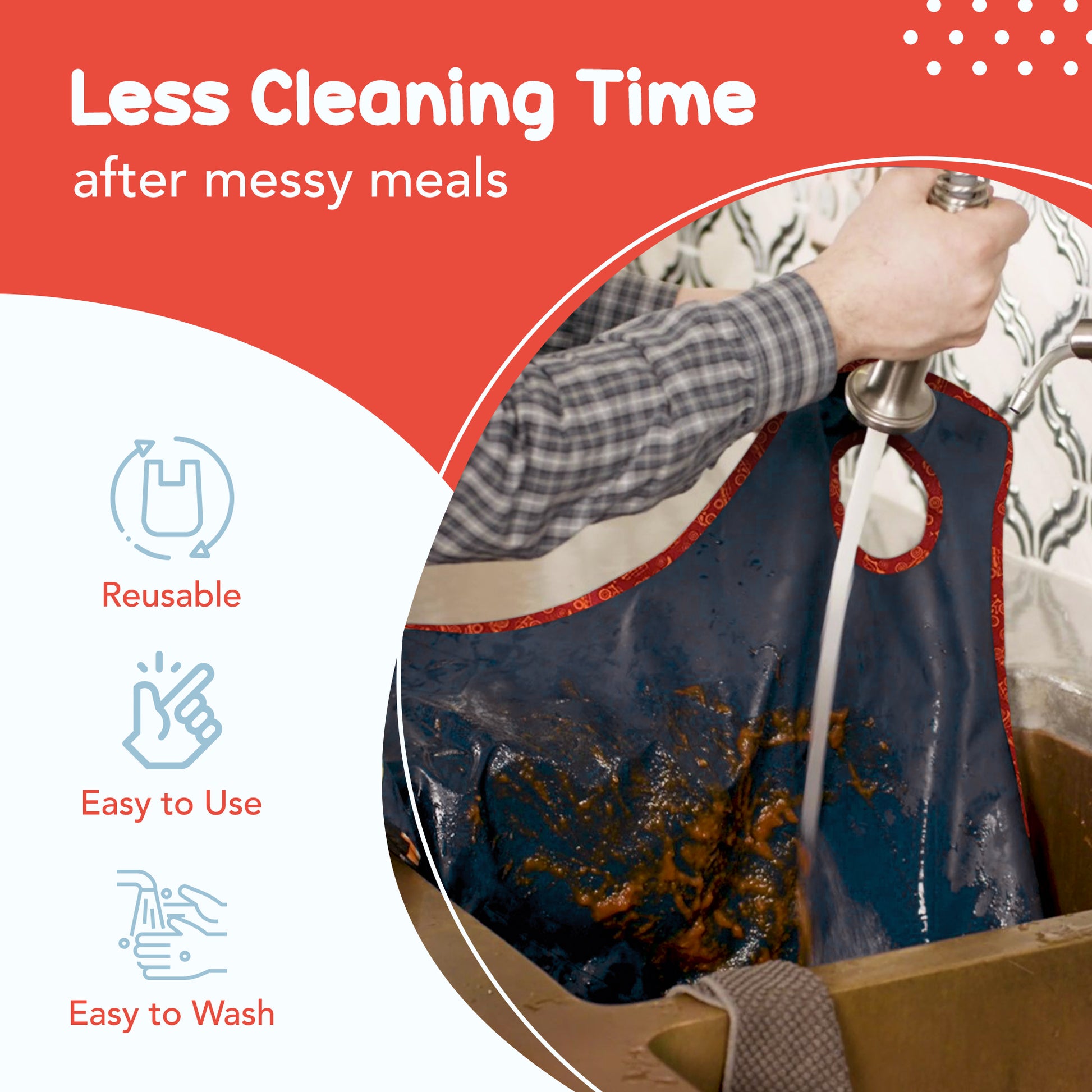 Cuts clean up time in half after messy meals & dramatically reduces laundry! Rinse, wipe and/or shake off into the sink. Reuse at every meal all day; multiple times before machine washing (usually weekly).