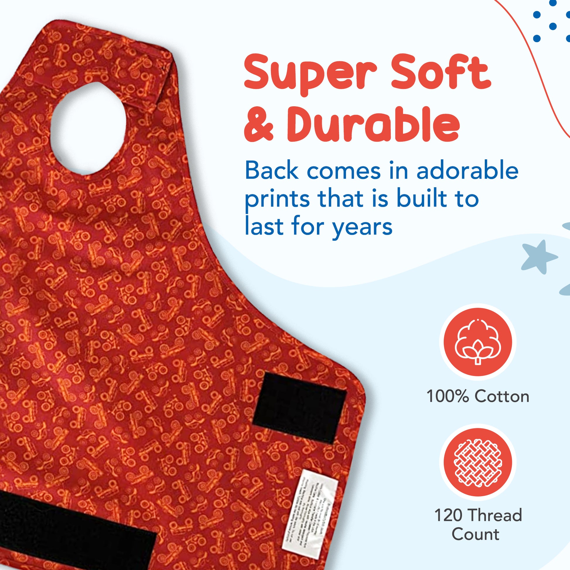 Keeps messy hands off clothes; No sleeves for quick and easy application. If they have long sleeves on, roll them up!